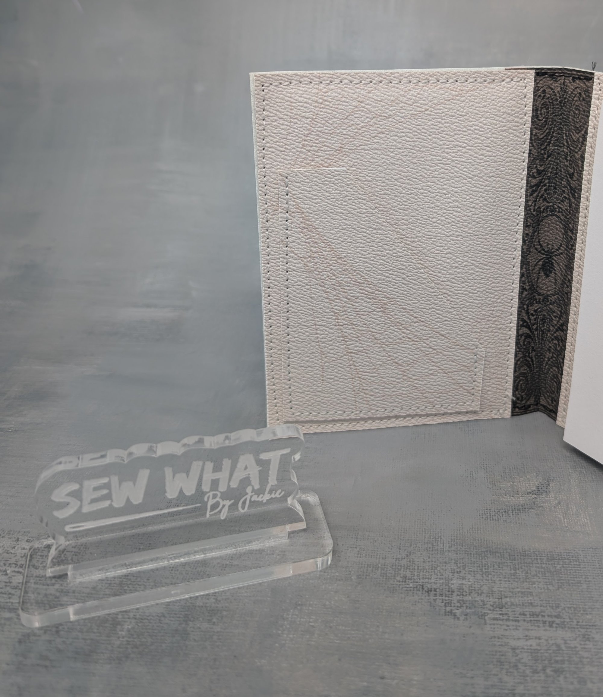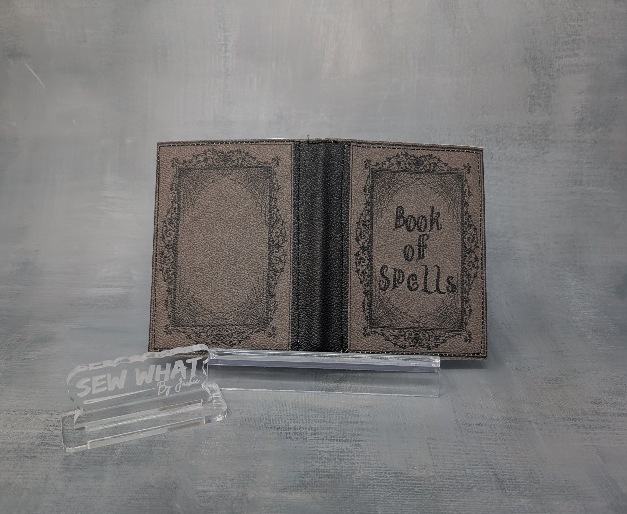 Handmade vinyl memo notepad holder made to look like a book with, "Book of Spells" on the cover. There are spiderweb and spider details inside.