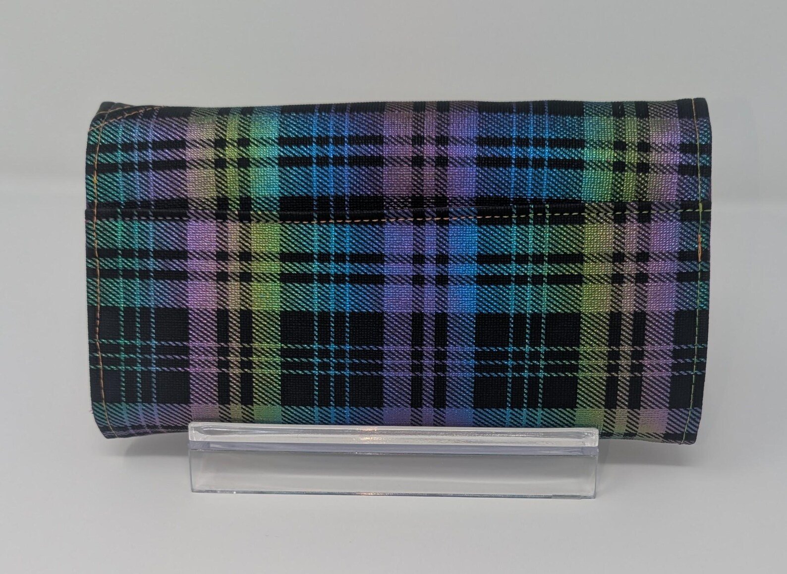Exterior is made with black rainbow plaid vinyl, with a bit of shimmer. interior is water resistant canvas in purple.