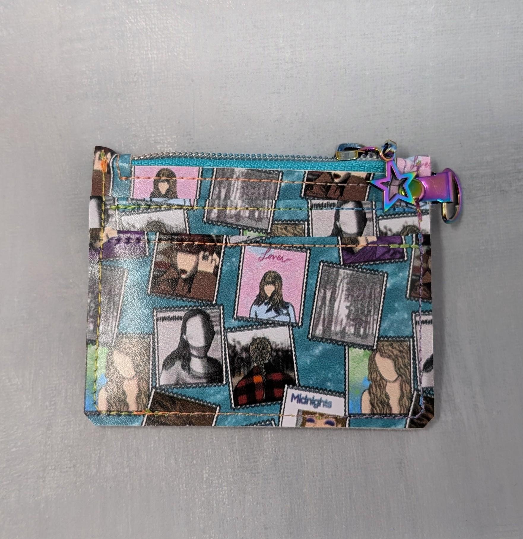 Handmade vinyl cardholder wallet with 4 card slots and a change pocket, available in Taylor Swift themed vinyl. Features rainbow finish zippers and zipper pulls.
